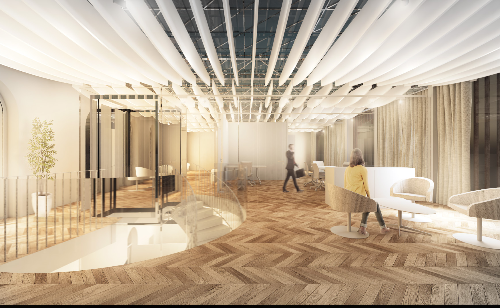 I volumi che fanno parte dell’area ristoro, hotel ed uffici, sono arretrati rispetto alla facciata principale della stazione, creando così una regolarità compositiva dove è possibile percepire la gerarchia degli elementi e le relazioni tra essi. Gli edifici sono posti in maniera sfalsata e tendono ad avvolgersi intorno ad un centro, questo rappresentato dalla corte principale interna, che funge da elemento di equilibrio tra le parti volumetriche, centro di gravità.