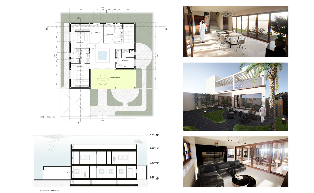 Il progetto mira a creare una residenza familiare autosufficiente nel deserto, libera dalla dipendenza da servizi pubblici e con un limitato ricorso a forniture esterne. Questa abitazione unica è progettata per offrire il massimo comfort, equiparabile a quello di un Edificio a Consumo Energetico Quasi Zero (NZEB), nel pieno rispetto delle rigorose normative ambientali internazionali.