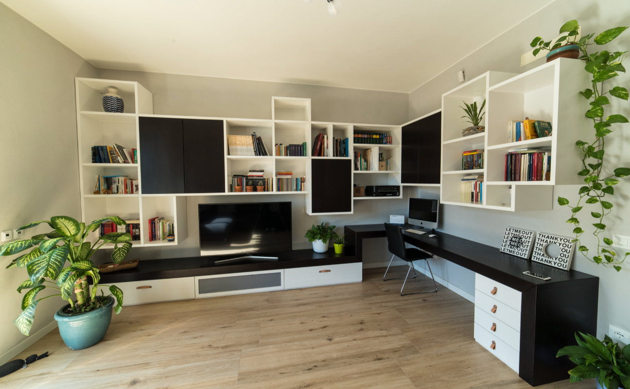 La progettazione ha poi risolto alcuni problemi funzionali garantendo una razionalizzazione degli spazi ed una loro maggiore fruizione. In particolare è stato creato un ambiente cucina – pranzo che, grazie ad una doppia porta scorrevole di dimensioni esattamente uguali all’apertura che porta in sala, diventa un unico grande ambiente, luminoso e piacevolmente vivibile. In sala è stato realizzato un grande arredo progettato su misura che rispondesse alle funzioni di parete attrezzata, mobile tv, contenitore, scrivania, postazione computer e libreria. La traduzione pratica è stata una unica parete attrezzata, in legno laccato bianco e wenge, che si snoda lungo due pareti ad L; mentre il ripiano e la scrivania sono realizzati attraverso un’unica fascia in legno molto spessa che nell’angolo cambia quota per unire quella più bassa della tv e quella più alta del pc. Il tutto attraverso un gioco di cubi modulari che si affiancano e si intersecano. Nella parte bassa del ripiano per la tv, trova posto anche un modulo di altoparlanti opportunamente schermati.