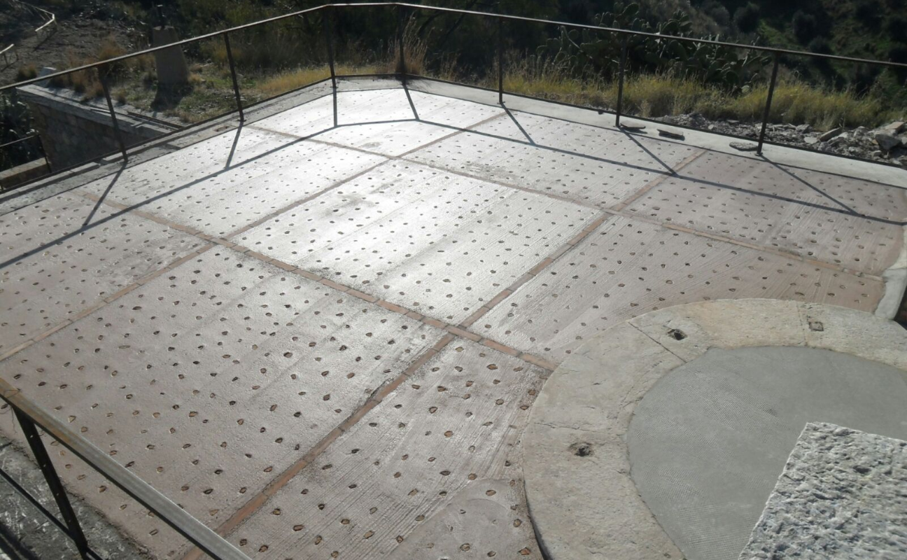 Pavimentazione aree esterne di copertura degli ambienti in cocciopesto con riquadrature in correnti di mattoni pieni posti di coltello