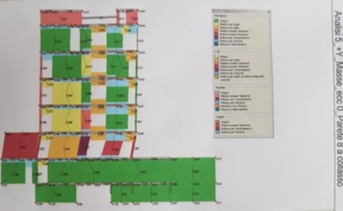 Raggiunto un livello di conoscenza comunque sufficiente e adottati i coefficienti di confidenza adeguati si è quindi proceduto all'analisi sismica considerando un comportamento "scatolare" soggetto quindi solo ad azioni "nel piano" che avrebbero sottoposto i muri per lo più ad azioni di taglio e pressoflessione.